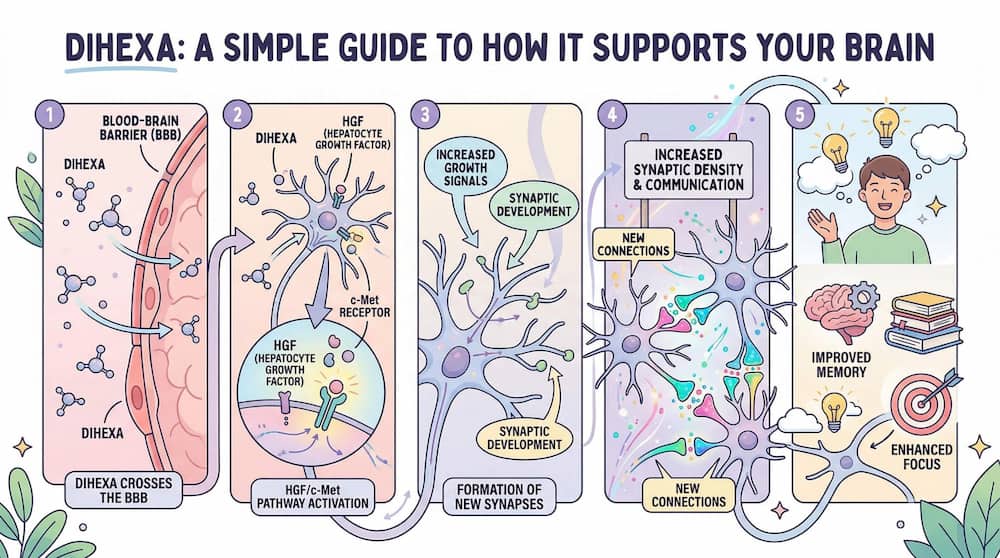 Dihexa activates the HGF/c-Met receptor pathway, which stimulates synaptogenesis – the formation of new synaptic connections between neurons. This structural effect on neural architecture is what distinguishes Dihexa from most nootropics, which act primarily through neurotransmitter modulation.