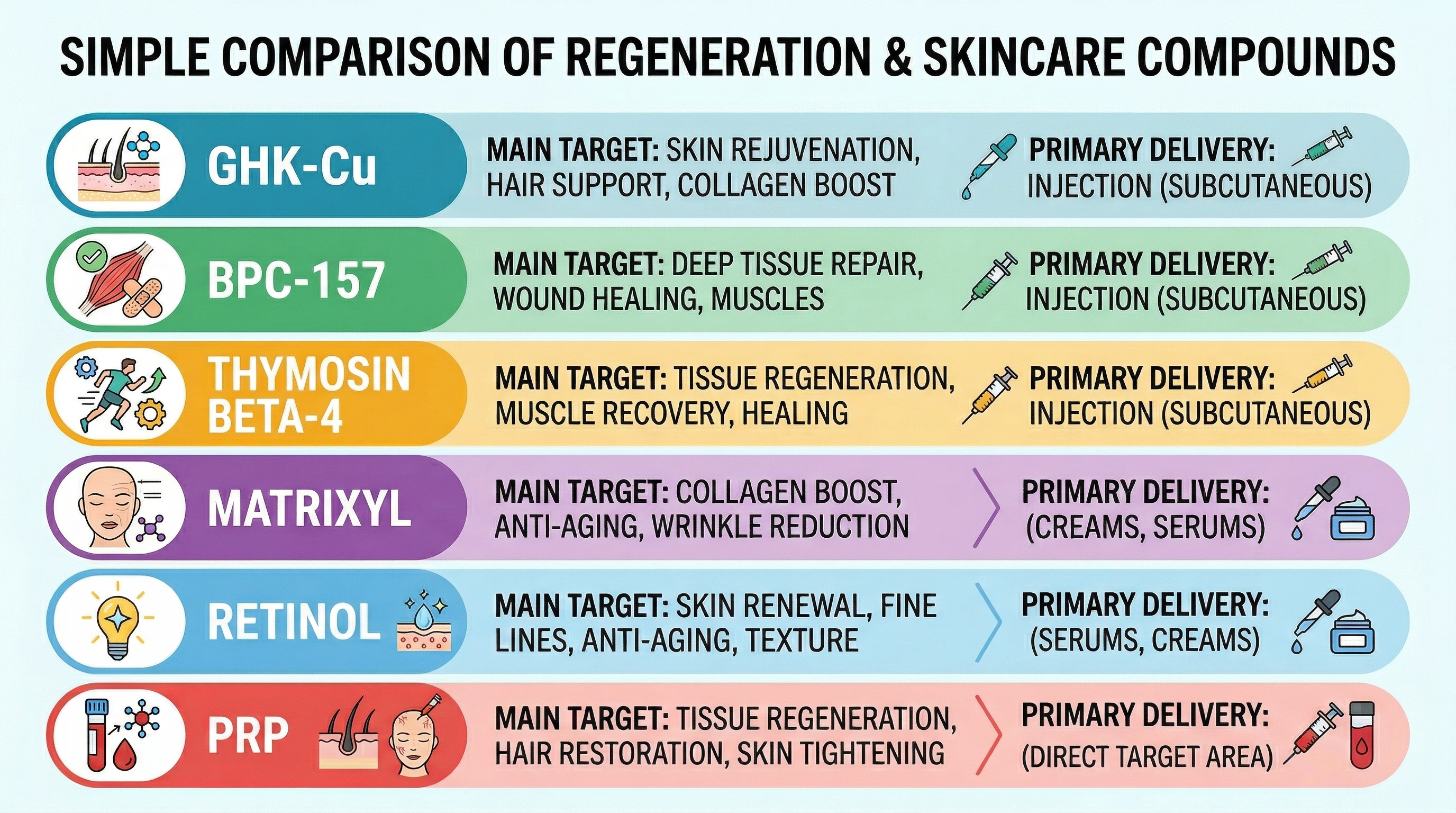 | PRP (Platelet-Rich Plasma) | Growth factor stimulation | Injectable | Moderate-strong (aesthetic) | Hair, skin laxity; can combine with GHK-Cu |
